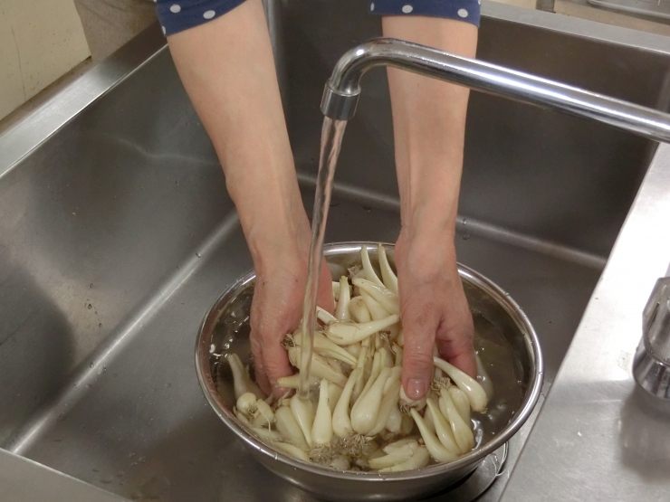 らっきょうは、泥を落とすためによく洗い、ひげ根と根を切り落とします。熱湯につけたあと漬けこむ容器に入れ、合わせ酢ととうがらしをいれれば、出来上がり。あとは上の写真のようにして2,3週間寝かせれば完成です。